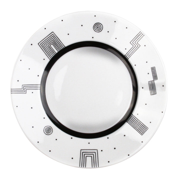 “Mythos” soup plate, part of the “Mythos” collection designed by Josef Hoffmann in a hand-painted geometric pattern on architectural inspired forms characteristic of the Art Deco period.