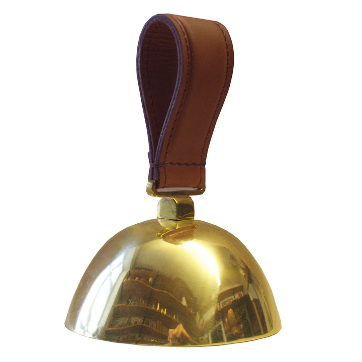 "Bell" #3310 with brown leather strap designed by Carl Auböck . His timeless mid-century objects were favoritesfavorites of Bauhaus founder Walter Gropius, who displayed several of them on his desk. This incredibly refined and sculptural piece is cast in solid brass from the original cast and carries the Werkstätte Carl Auböck stamp.